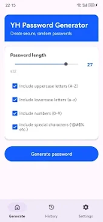 O YH Password Generator é um aplicativo gratuito para Android que oferece uma solução prática para a criação de senhas seguras e complexas. Com uma interface intuitiva, o aplicativo permite que os usuários personalizem a geração de senhas, ajustando critérios como comprimento e a inclusão de caracteres especiais, números e letras maiúsculas. Isso facilita a obtenção de senhas robustas que atendem a diferentes requisitos de segurança, garantindo a proteção das informações pessoais dos usuários.